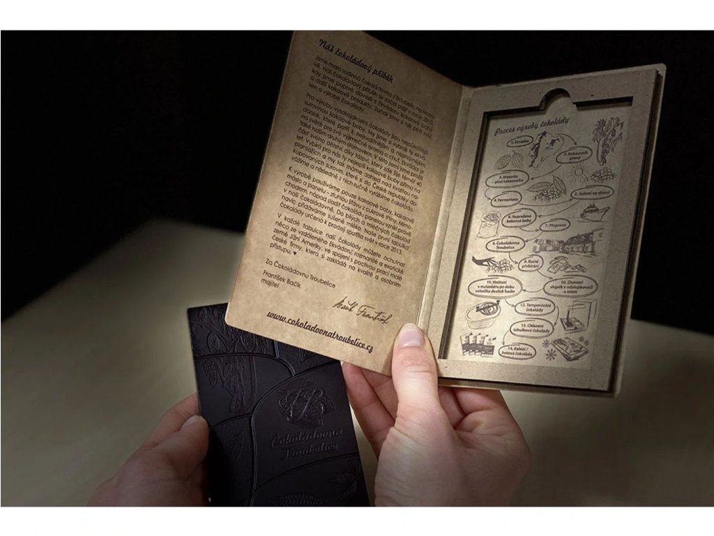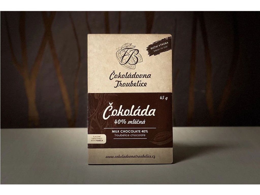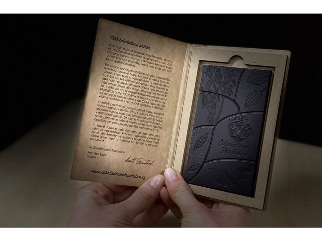 Česká rodinná čokoládovna z Troubelic na Moravě nabízí ručně vyrobené produkty z kvalitních kakaových bobů přímo z plantáží Ekvádoru. K výrobě čokolády využívají pouze kakaové boby, kakaové máslo a panelu k doslazení. Produkty jsou nealkalizované, bez přidaných látek, konzervantů, sladidel, lepku a lecitinu.