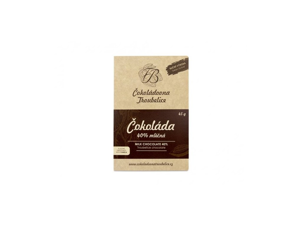 40% mléčná čokoláda byla vyrobena speciálně pro děti a milovníky sladších chutí. Její velmi jemná a sladká chuť potěší chuťové buňky těch největších mlsných jazýčků. Čokoláda je slazena panelou - ztuhlou třtinovou šťávou v bio kvalitě, která není rafinovaná a přirozeně obsahuje melasu.