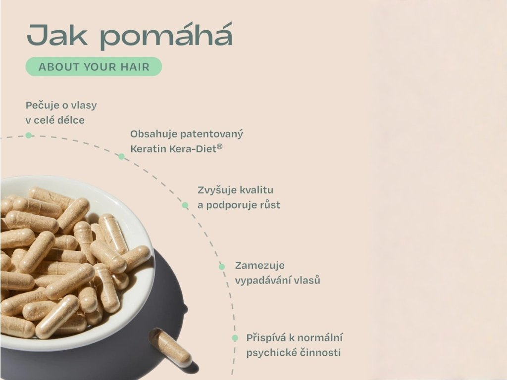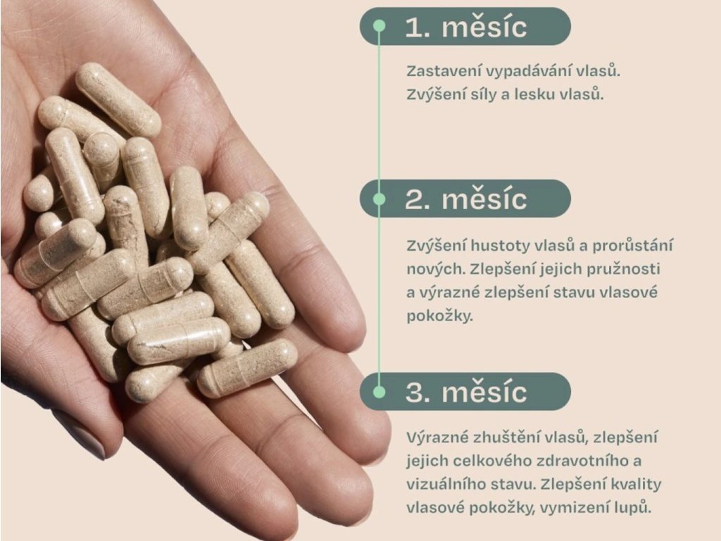 - Růst a pevnost vlasů: Saw Palmetto, biotin, selen, rukola, L-cystein a L-methionin podporují růst vlasů, tvorbu keratinu a jejich celkovou pevnost.