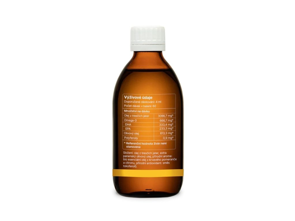 - Zdroj kvalitních omega 3: EPA 233,3 mg a DHA 333,4 mg ve 4 ml oleje z tresčích jater (divoce žijící treska obecná).